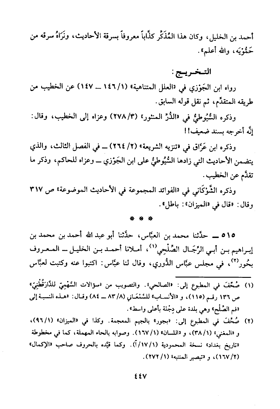 ٥١٥ - حدَّثنا محمد بن العبَّاس، حدَّثنا أبو عبد اللَّه أحمد بن محمد بن إبراهيم بن أبي الرِّجَال الصِّلْحِي (¬١)، أملانا أحمد بن الخليل -المعروف بحُور (¬٢)، في مجلس عبَّاس الدُّوري، وقال لنا عبَّاس: اكتبوا عنه وكتبت لعبَّاس