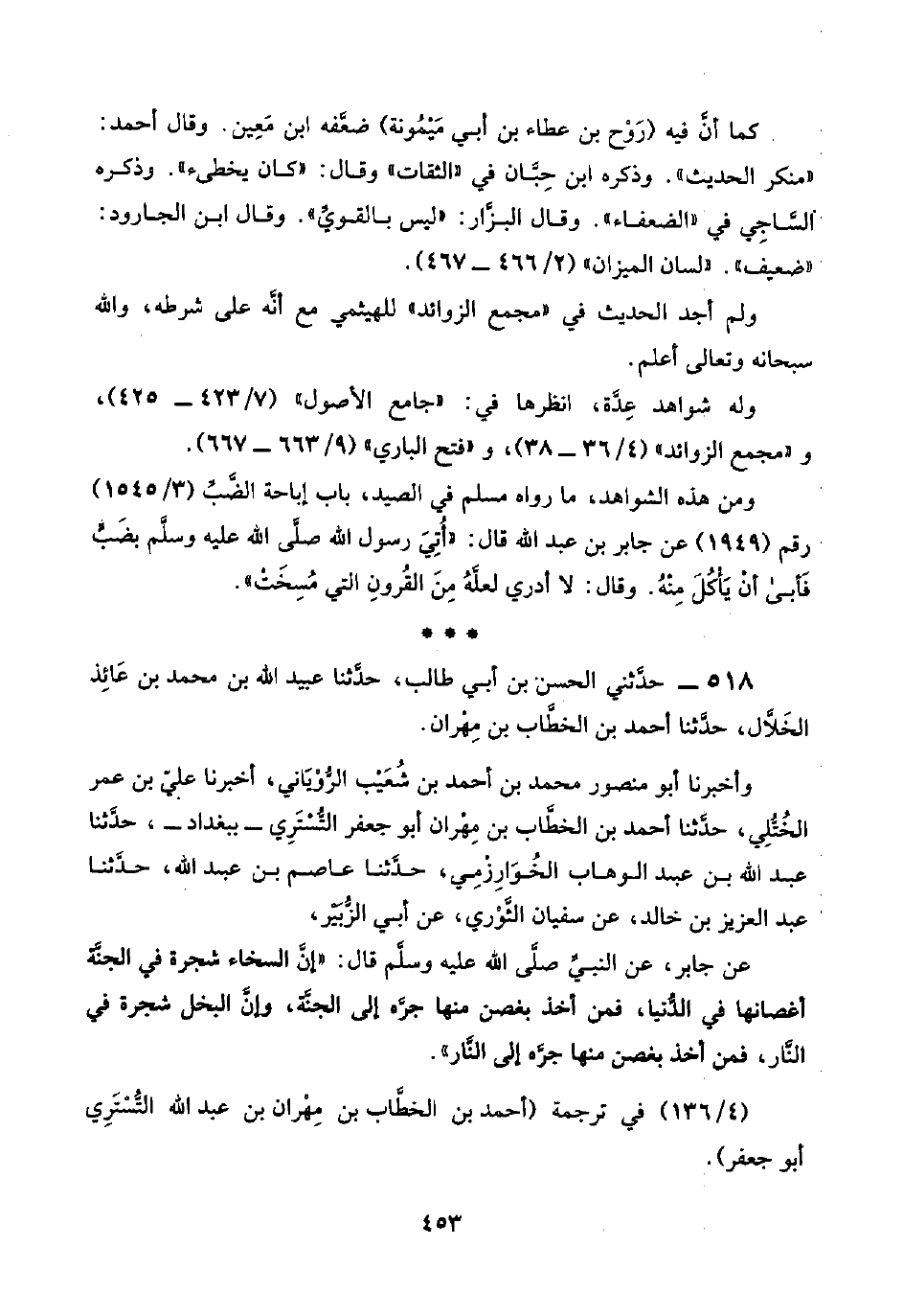 عن جابر، عن النبيِّ صلَّى اللَّه عليه وسلَّم قال: "إنَّ السخاء شجرة في الجنَّة أغصانها في الدُّنيا، فمن أخذ بغصن منها جرَّه إلى الجنَّة، وإنَّ البخل شجرة في النَّار، فمن أخذ بغصن منها جرَّه إلى النَّار".