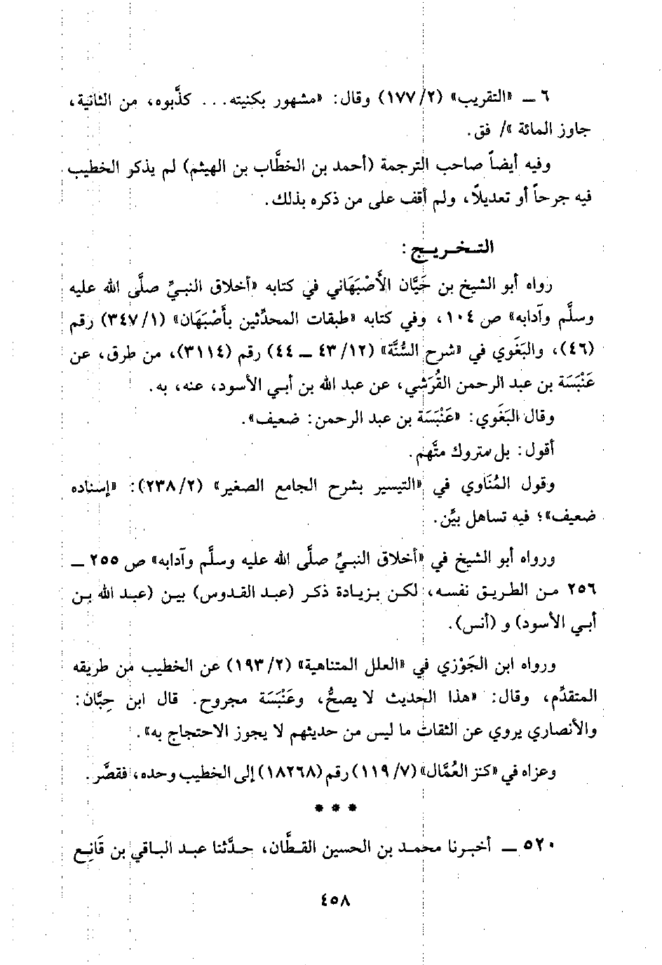 رواه أبو الشيخ بن حَيَّان الأَصْبَهَاني في كتابه "أخلاق النبيِّ صلَّى اللَّه عليه وسلَّم وآدابه" ص ١٠٤، وفي كتابه "طبقات المحدِّثين بأَصْبَهَان" (١/ ٣٤٧) رقم (٤٦)، والبَغَوي في "شرح السُّنَّة" (١٢/ ٤٣ - ٤٤) رقم (٣١١٤)، من طرق، عن عَنْبَسَة بن عبد الرحمن القُرَشي، عن عبد اللَّه بن أبي الأسود، عنه، به.