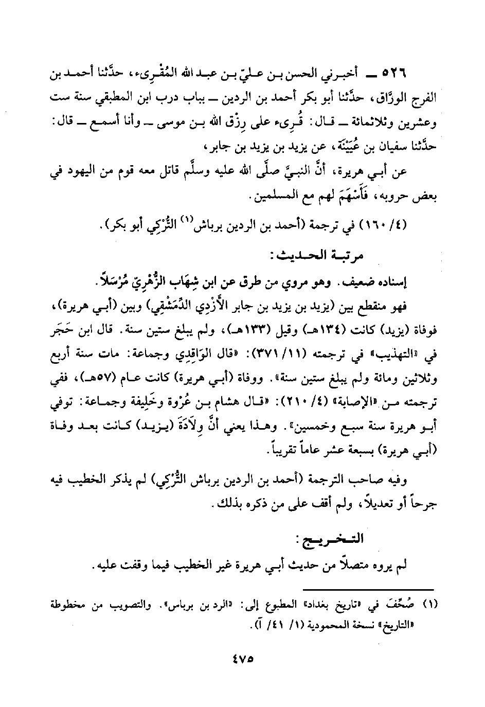 ٥٢٦ - أخبرني الحسن بن عليّ بن عبد اللَّه المُقْرِئ، حدَّثنا أحمد بن الفرج الورَّاق، حدَّثنا أبو بكر أحمد بن الردين -بباب درب ابن المطبقي سنة ست وعشرين وثلاثمائة- قال: قُرِئ على رِزْق اللَّه بن موسى -وأنا أسمع- قال: حدَّثنا سفيان بن عُيَيْنَة، عن يزيد بن يزيد بن جابر،