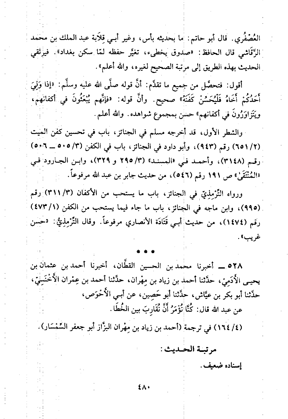 ٥٢٨ - أخبرنا محمد بن الحسين القطَّان، أخبرنا أحمد بن عثمان بن يحيى الأَدَمِيّ، حدَّثنا أحمد بن زياد بن مِهْران، حدَّثنا أحمد بن عِمْران الأَخْنَسِيّ، حدَّثنا أبو بكر بن عيَّاش، حدَّثنا أبو حَصِيْن، عن أبي الأَحْوَص،