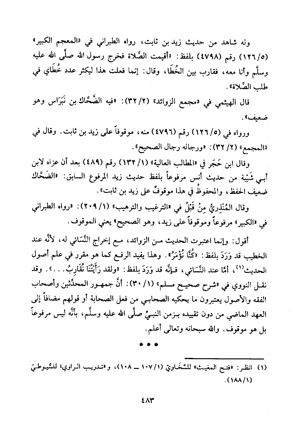 وقال المُنْذِريُّ مِنْ قَبْلُ في "الترغيب والترهيب" (١/ ٢٠٩): "رواه الطبراني في "الكبير" مرفوعًا وموقوفًا على زيد، وهو الصحيح" يعني الموقوف.