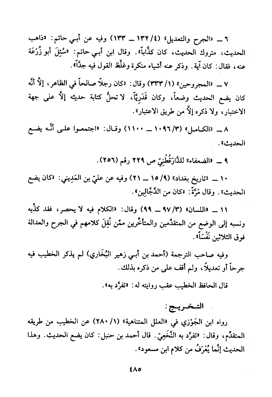 ١٠ - "تاريخ بغداد" (٩/ ١٥ - ٢١) وفيه عن عليّ بن المَدِيني: "كان يضع الحديث". وقال مَرَّةً: "كان من الدَّجَّالِين".