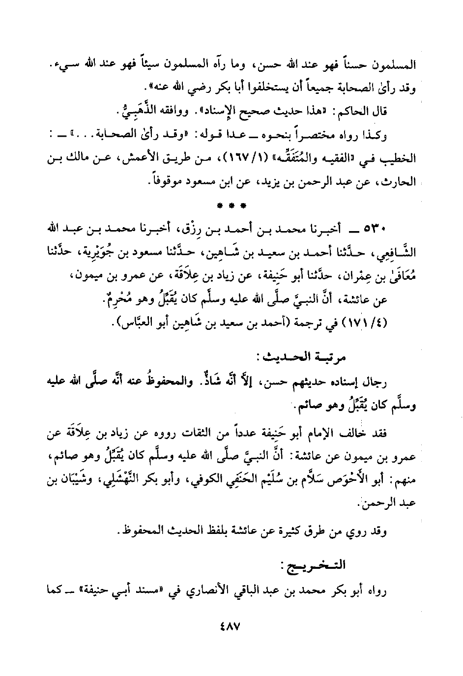 ٥٣٠ - أخبرنا محمد بن أحمد بن رِزْق، أخبرنا محمد بن عبد اللَّه الشَّافِعِي، حدَّثنا أحمد بن سعيد بن شَاهِين، حدَّثنا مسعود بن جُوَيْرِية، حدَّثنا مُعَافَى بن عِمْران، حدَّثنا أبو حَنِيفة، عن زياد بن عِلَاقَة، عن عمرو بن ميمون، عن عائشة، أنَّ النبيَّ صلَّى اللَّه عليه وسلَّم كان يُقَبِّلُ وهو مُحْرِمٌ.