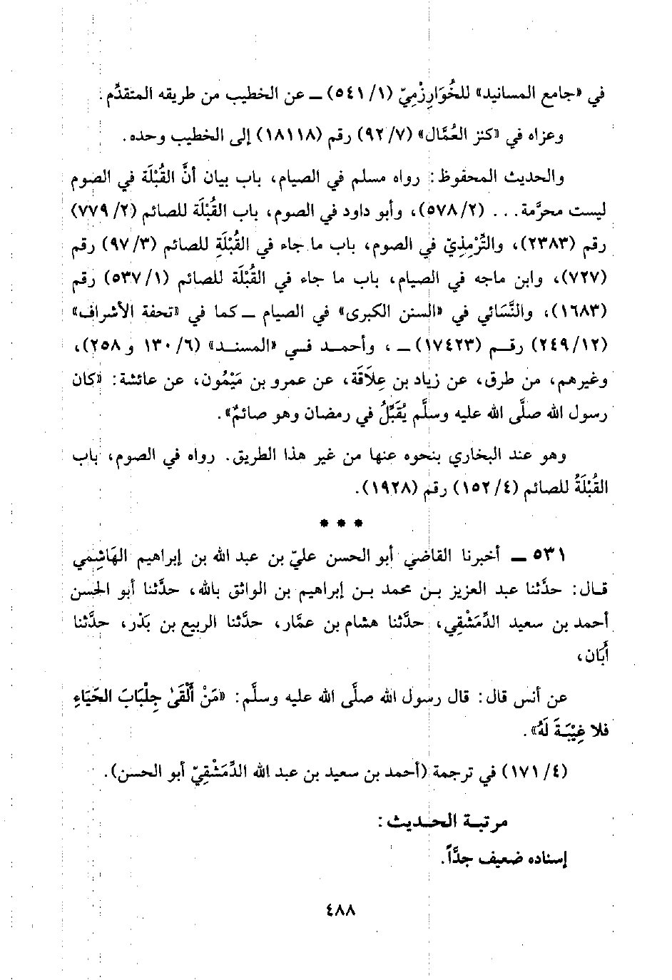 ٥٣١ - أخبرنا القاضي أبو الحسن عليّ بن عبد اللَّه بن إبراهيم الهَاشِمي قال: حدَّثنا عبد العزيز بن محمد بن إبراهيم بن الواثق باللَّه، حدَّثنا أبو الحسن أحمد بن سعيد الدِّمَشْقِي، حدَّثنا هشام بن عمَّار، حدَّثنا الربيع بن بَدْر، حدَّثنا أَبْان،