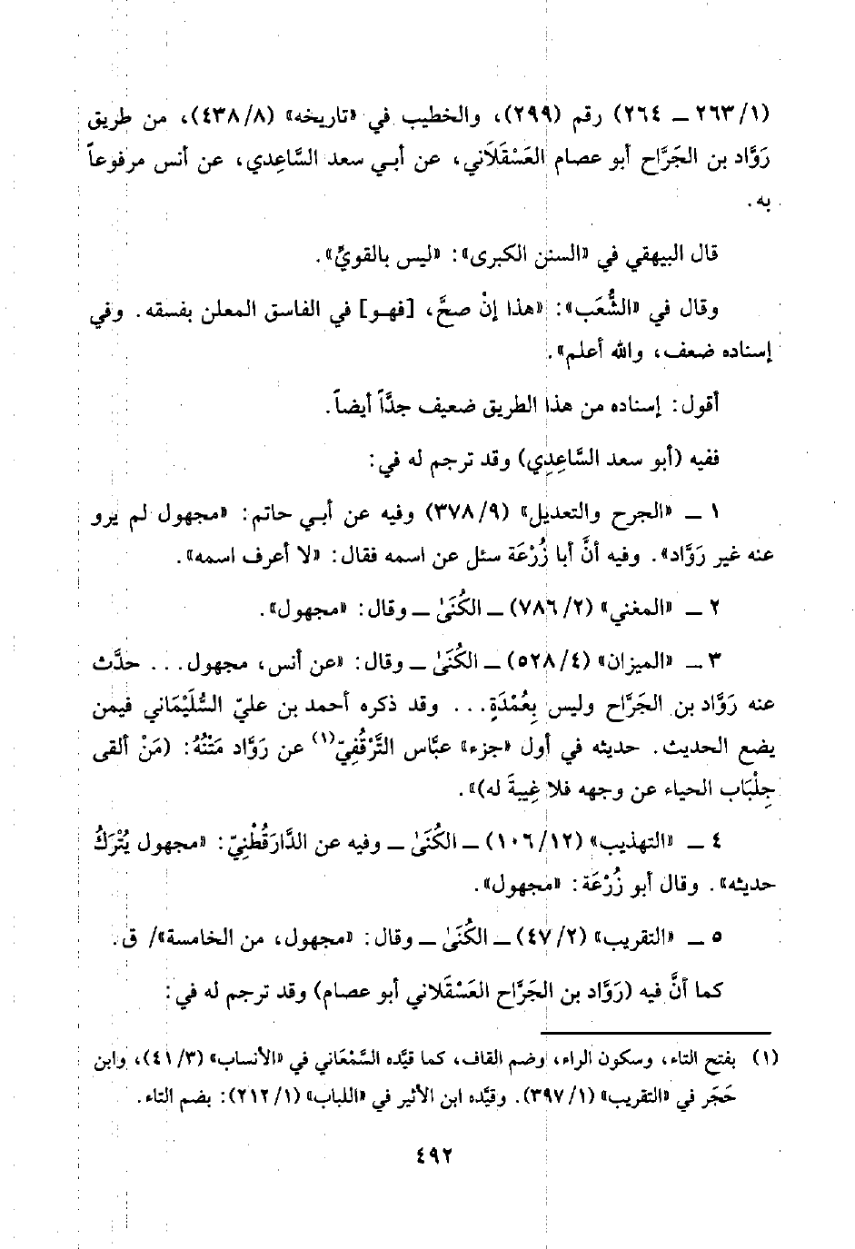 ٣ - "الميزان" (٤/ ٥٢٨) -الكُنَى- وقال: "عن أنس، مجهول. . . حدَّث عنه رَوَّاد بن الجَرَّاح وليس بِعُمْدَةٍ. . . وقد ذكره أحمد بن عليّ السُّلَيْمَاني فيمن يضع الحديث. حديثه في أول "جزء" عبَّاس التَّرْقُفِيّ (¬١) عن رَوَّاد مَتْنُهُ: (مَنْ ألقي جِلْبَاب الحياء عن وجهه فلا غِيبةَ له) ".