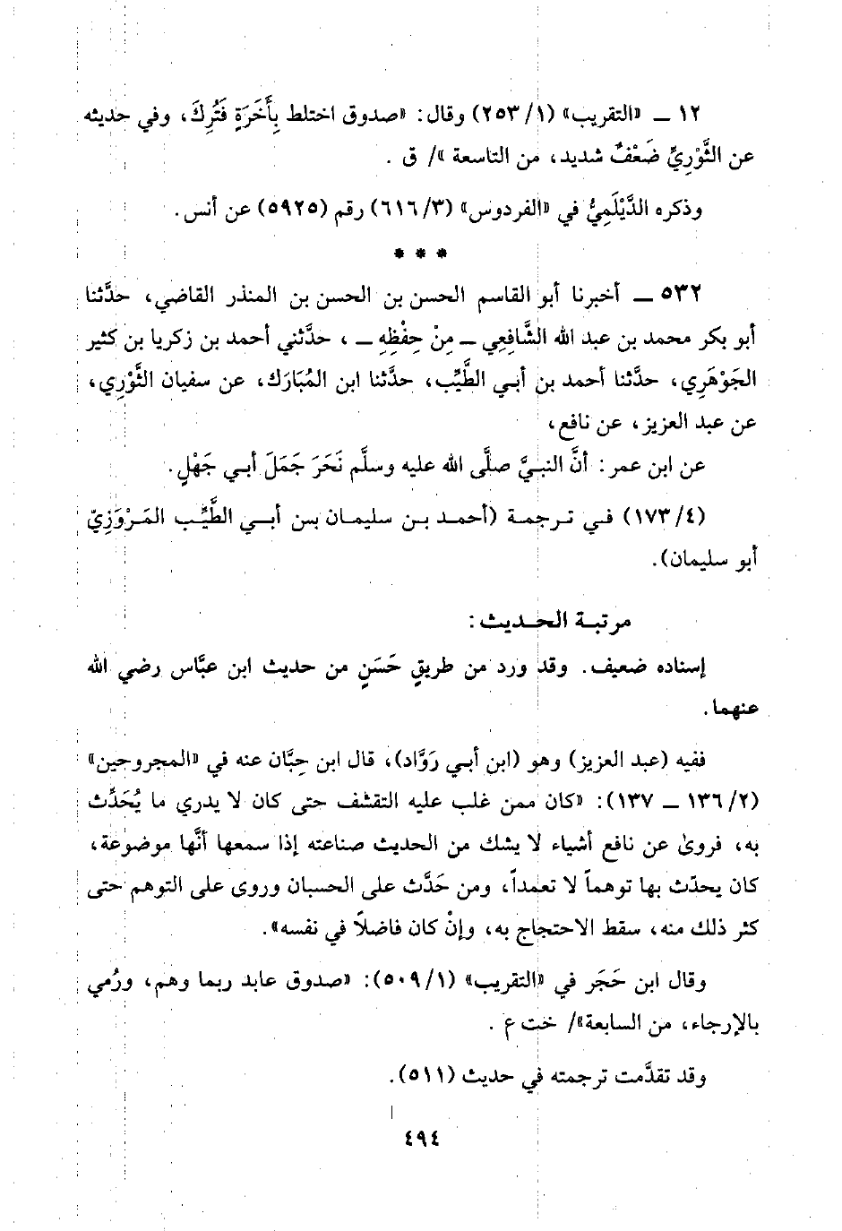 ٥٣٢ - أخبرنا أبو القاسم الحسن بن الحسن بن المنذر القاضي، حدَّثنا أبو بكر محمد بن عبد اللَّه الشَّافِعِي -مِنْ حِفْظِهِ-، حدَّثني أحمد بن زكريا بن كثير الجَوْهَرِيّ، حدَّثنا أحمد بن أبي الطيِّب، حدَّثنا ابن المُبَارك، عن سفيان الثَّوْرِي، عن عبد العزيز، عن نافع،