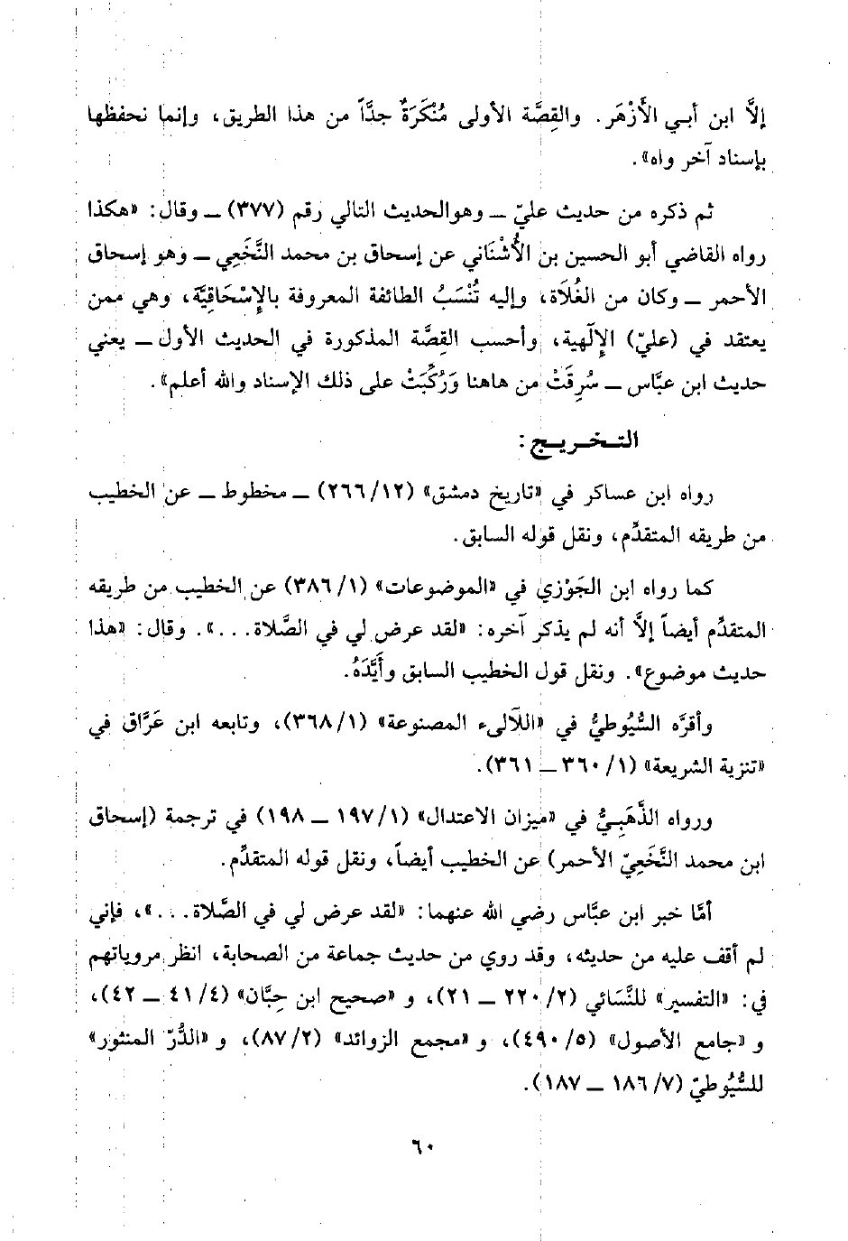 ثم ذكره من حديث عليّ -وهو الحديث التالي رقم (٣٧٧) - وقال: "هكذا رواه القاضي أبو الحسين بن الأُشْنَانِي عن إسحاق بن محمد النَّخَعِي -وهو إسحاق الأحمر- وكان من الغُلَاة، وإليه تُنْسَبُ الطائفة المعروفة بالإِسْحَاقِيَّة، وهي ممن يعتقد في (عليّ) الإِلهية، وأحسب القِصَّة المذكورة في الحديث الأول -يعني حديث ابن عبَّاس- سُرِقَتْ من هاهنا وَرُكِّبَتْ على ذلك الإسناد واللَّه أعلم.