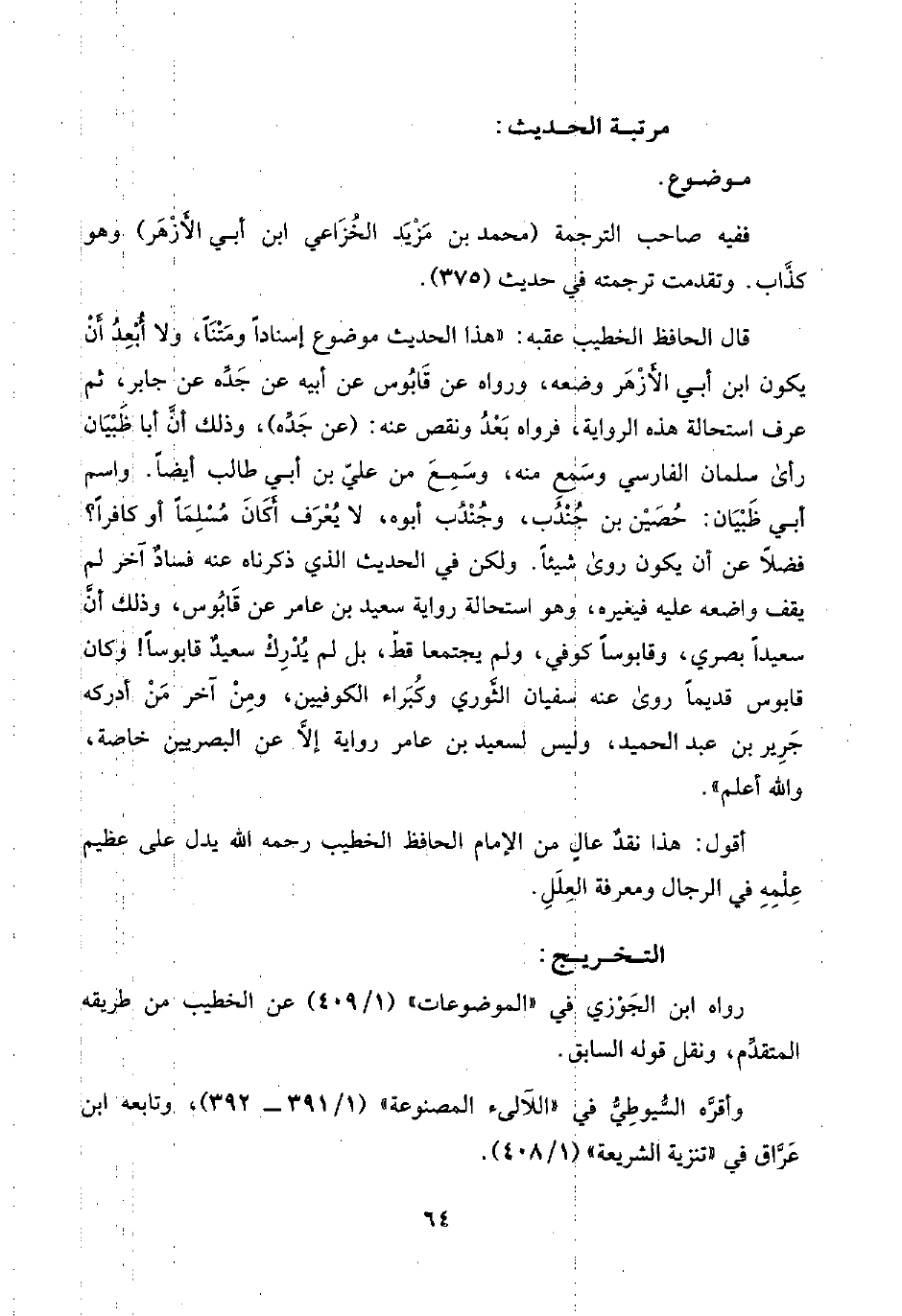 قال الحافظ الخطيب عقبه: "هذا الحديث موضوع إسنادًا ومَتْنًا، ولا أُبْعِدُ أَنْ يكون ابن أبي الأَزْهَر وضعه، ورواه عن قَابُوس عن أبيه عن جَدِّه عن جابر، ثم عرف استحالة هذه الرواية، فرواه بَعْدُ ونقص عنه: (عن جَدِّه)، وذلك أنَّ أبا ظَبْيَان رأى سلمان الفارسي وسَمِع منه، وسَمِعَ من عليّ بن أبي طالب أيضًا. واسم أبي ظَبْيَان: حُصَيْن بن جُنْدُب، وجُنْدُب أبوه، لا يُعْرَف أَكَانَ مُسْلِمًا أو كافرًا؟ فضلًا عن أن يكون روى شيئًا. ولكن في الحديث الذي ذكرناه عنه فسادٌ آخر لم يقف واضعه عليه فيغيره، وهو استحالة رواية سعيد بن عامر عن قَابُوس، وذلك أنَّ سعيدًا بصري، وقابوسًا كوفي، ولم يجتمعا قطّ، بل لم يُدْرِكْ سعيدٌ قابوسًا! وكان قابوس قديمًا روى عنه سفيان الثَّوْري وكُبَراء الكوفيين، ومِنْ آخر مَنْ أدركهـ جَرير بن عبد الحميد، وليس لسعيد بن عامر رواية إلَّا عن البصريين خاصة، واللَّه أعلم".