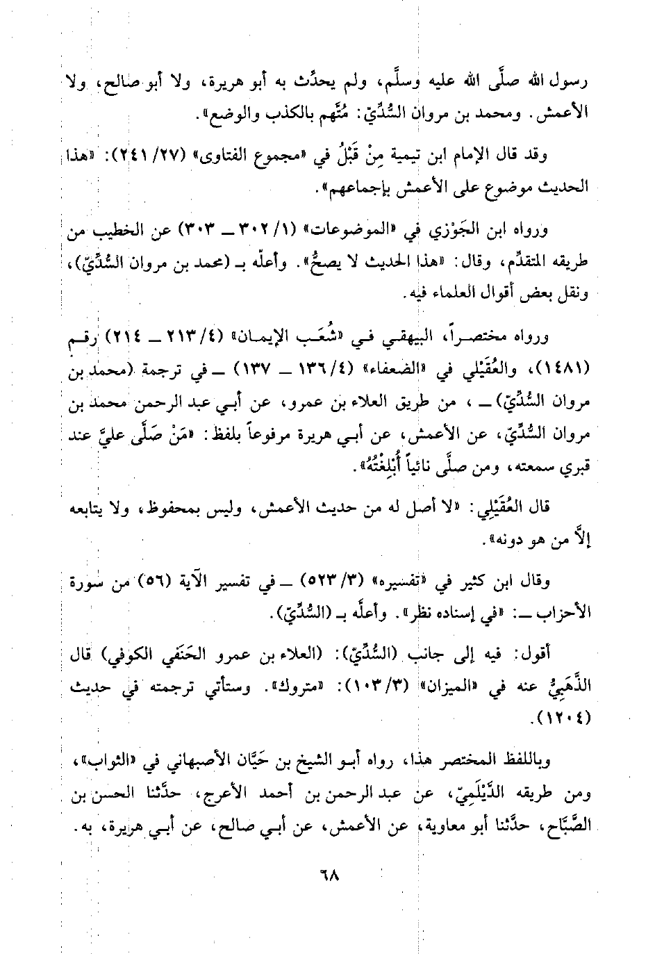 رسول اللَّه صلَّى اللَّه عليه وسلَّم، ولم يحدِّث به أبو هريرة، ولا أبو صالح، ولا الأعمش. ومحمد بن مروان السُّدِّيّ: مُتَّهم بالكذب والوضع".