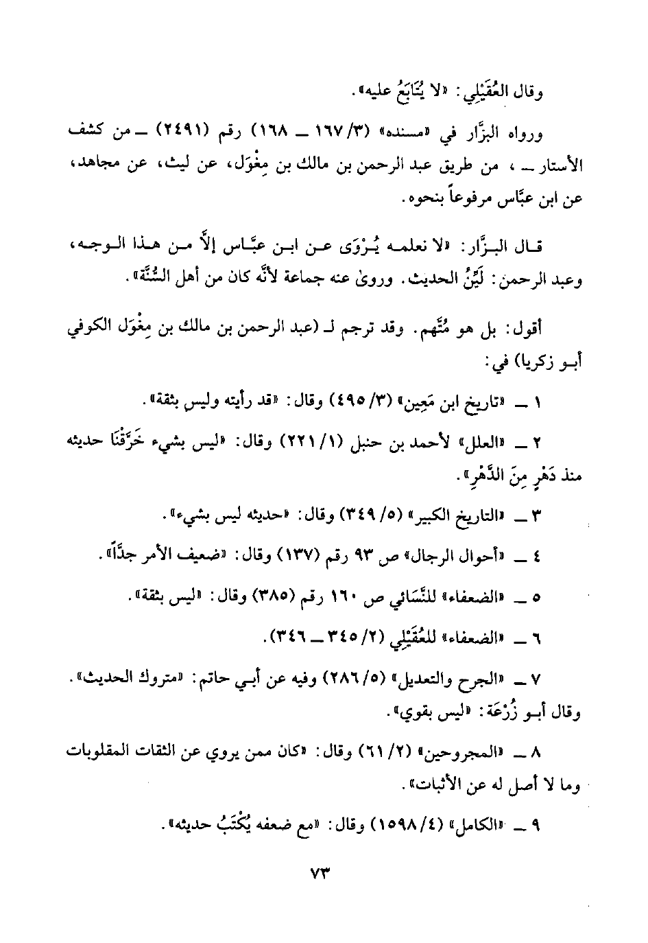 أقول: بل هو مُتَّهم. وقد ترجم لـ (عبد الرحمن بن مالك بن مِغْوَل الكوفي أبو زكريا) في: