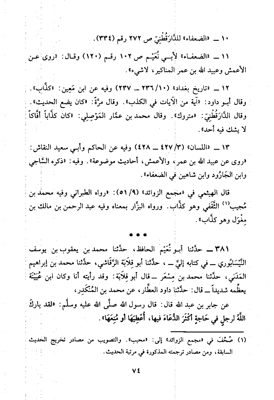 ٣٨١ - حدَّثنا أبو نُعَيْم الحافظ، حدَّثنا محمد بن يعقوب بن يوسف النَّيْسَابُوري -في كتابه إليَّ-، حدَّثنا أبو قِلَابة الرَّقَاشي، حدَّثنا محمد بن إبراهيم المَدَني، حدَّثنا محمد بن مِسْعَر -قال أبو قِلَابة: وقد رأيته أنا وكان ابن عُيَيْنَة يعظِّمه شديدًا- قال: حدَّثنا داود العطَّار، عن محمد بن المُنْكَدِر،