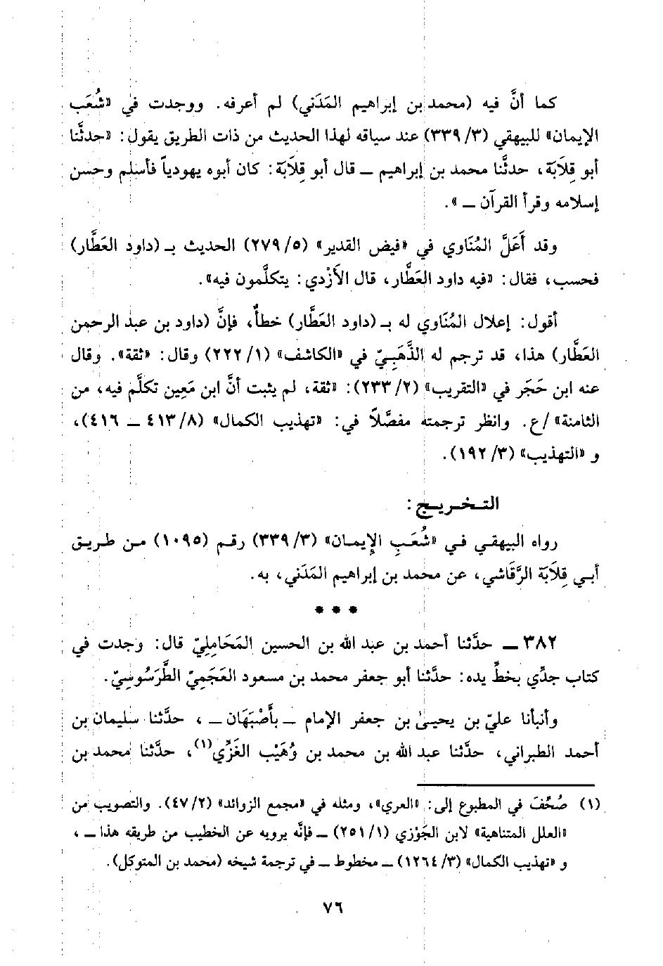 ٣٨٢ - حدَّثنا أحمد بن عبد اللَّه بن الحسين المَحَامِلِيّ قال: وجدت في كتاب جدِّي بخطٍّ يده: حدَّثنا أبو جعفر محمد بن مسعود العَجَمِيّ الطَّرَسُوسِيّ.