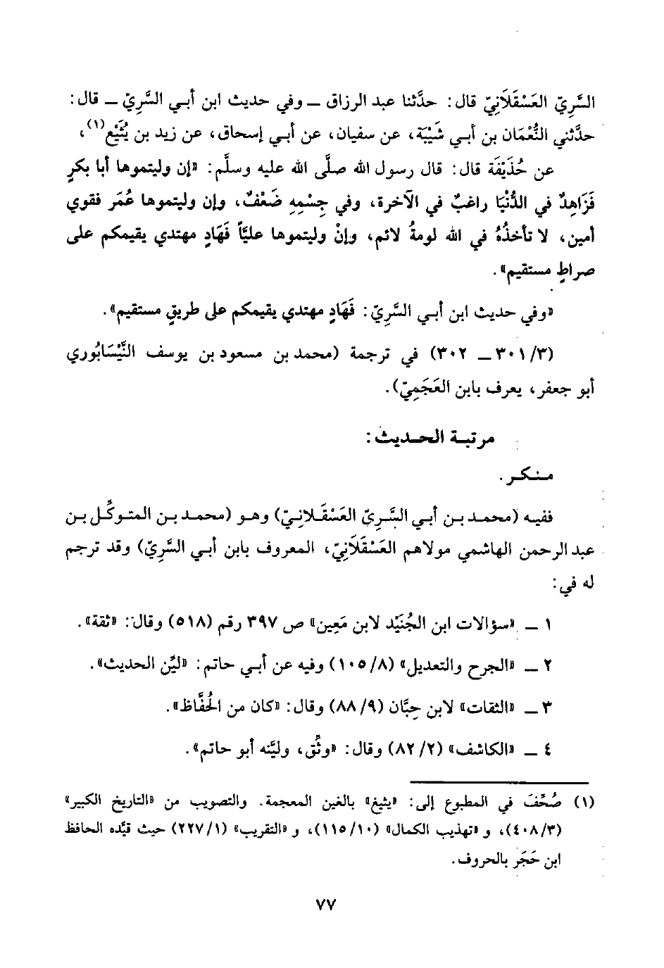 السَّرِيّ العَسْقَلَانِيّ قال: حدَّثنا عبد الرزاق -وفي حديث ابن أبي السَّرِيّ- قال: حدَّثني النُّعمَان بن أبي شَيْبَة، عن سفيان، عن أبي إسحاق، عن زيد بن يُثَيْع (¬١)،