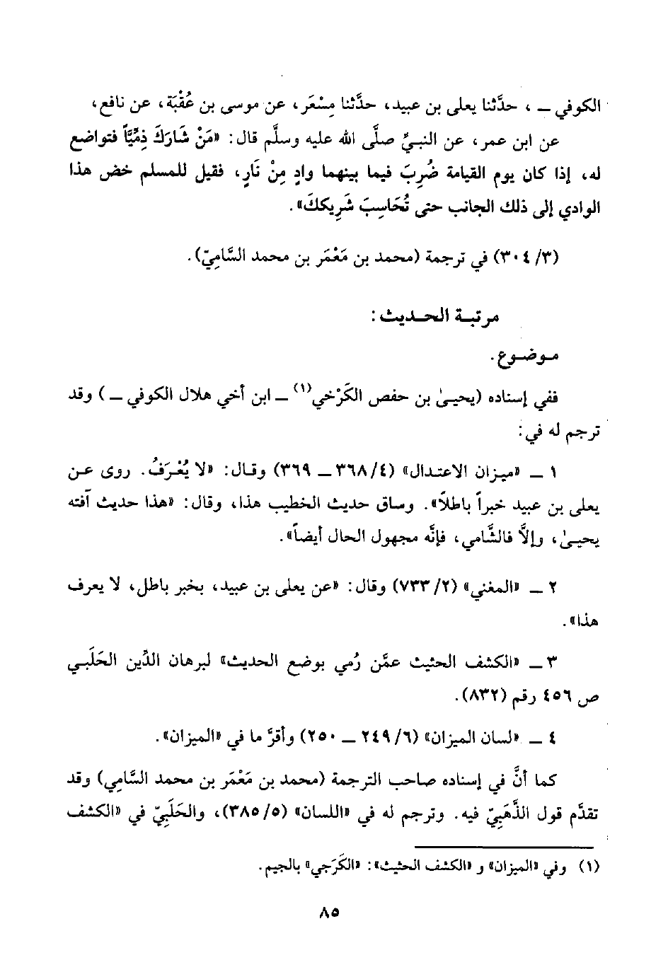 ١ - "ميزان الاعتدال" (٤/ ٣٦٨ - ٣٦٩) وقال: "لا يُعْرَفُ. روى عن يعلى بن عبيد خبرًا باطلًا". وساق حديث الخطيب هذا، وقال: "هذا حديث آفته يحيى، وإلَّا فالشَّامي، فإنَّه مجهول الحال أيضًا".