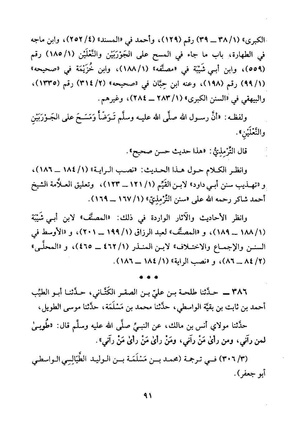 الكبرى" (١/ ٣٨ - ٣٩) رقم (١٢٩)، وأحمد في "المسند" (٤/ ٢٥٢)، وابن ماجه في الطهارة، باب ما جاء في المسح على الجَوْرَبَيْنِ والنَّعْلَيْنِ (١/ ١٨٥) رقم (٥٥٩)، وابن أبي شَيْبَة في "مصنَّفه" (١/ ١٨٨)، وابن خُزَيْمَة في "صحيحه" (١/ ٩٩) رقم (١٩٨)، وعنه ابن حِبَّان في "صحيحه" (٢/ ٣١٤) رقم (١٣٣٥)، والبيهقي في "السنن الكبرى" (١/ ٢٨٣ - ٢٨٤)، وغيرهم.