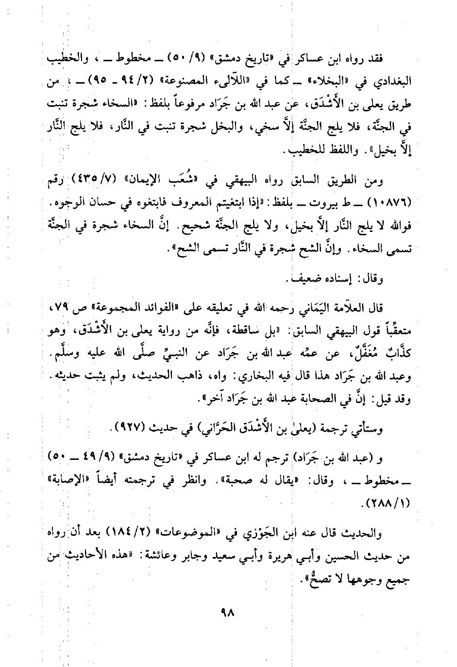 قال العلّامة اليَمَاني رحمه اللَّه في تعليقه على "الفوائد المجموعة" ص ٧٩، متعقِّبًا قول البيهقي السابق: "بل ساقطة، فإنَّه من رواية يعلى بن الأَشْدَق، وهو كذَّابٌ مُغَفَّلٌ، عن عمِّه عبد اللَّه بن جَرَاد عن النبيِّ صلَّى اللَّه عليه وسلَّم. وعبد اللَّه بن جَرَاد هذا قال فيه البخاري: واه، ذاهب الحديث، ولم يثبت حديثه. وقد قيل: إنَّ في الصحابة عبد اللَّه بن جَرَاد آخر".