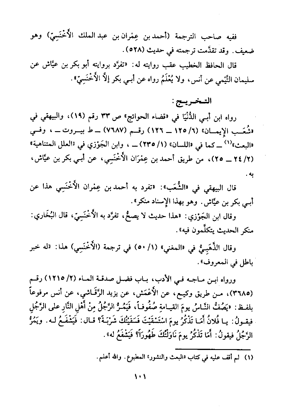وقال الذَّهَبِيُّ في "المغني" (١/ ٥٠) في ترجمة (الأَخْنَسِي) هذا: "له خبر باطل في المعروف".