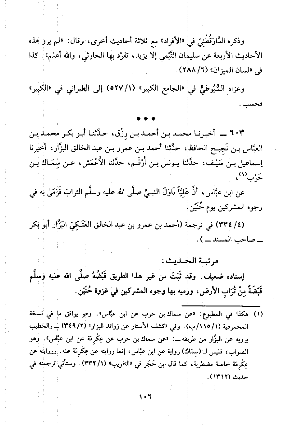 ٦٠٣ - أخبرنا محمد بن أحمد بن رِزْق، حدَّثنا أبو بكر محمد بن العبَّاس بن نَجِيح الحافظ، حدَّثنا أحمد بن عمرو بن عبد الخالق البزَّار، أخبرنا إسماعيل بن سَيْف، حدَّثنا يونس بن أَرْقَم، حدَّثنا الأَعْمَش، عن سِمَاك بن حَرْب (¬١)،