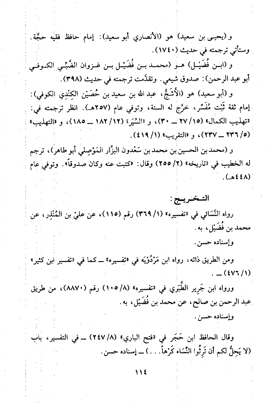 وقال الحافظ ابن حَجَر في "فتح الباري" (٨/ ٢٤٧) -في التفسير، باب {لَا يَحِلُّ لَكُمْ أَنْ تَرِثُوا النِّسَاءَ كَرْهًا. . .} - إسناده حسن.
