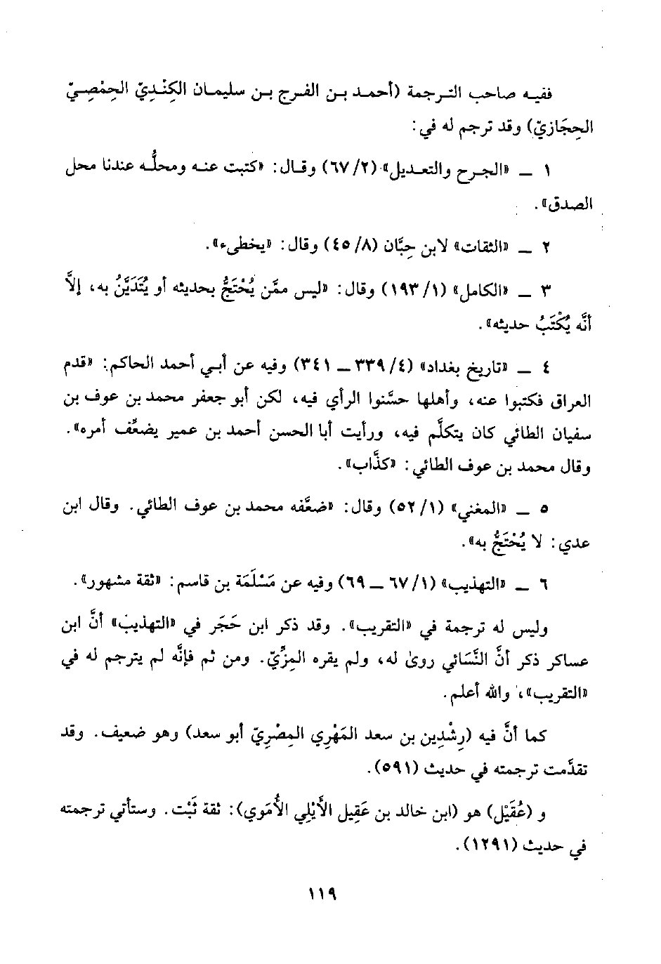 ٥ - "المغني" (١/ ٥٢) وقال: "ضعَّفه محمد بن عوف الطائي. وقال ابن عدي: لا يُحْتَجُّ به".