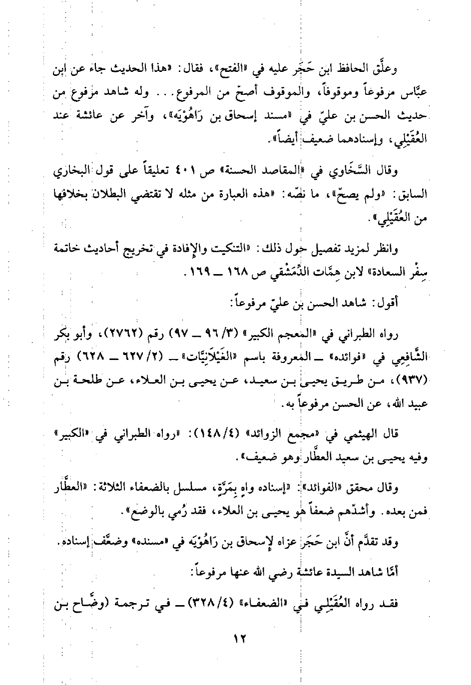 وقال السَّخَاوي في "المقاصد الحسنة" ص ٤٠١ تعليقًا على قول البخاري السابق: "ولم يصحّ"، ما نصّه: "هذه العبارة من مثله لا تقتضي البطلان بخلافها من العُقَيْلِي".