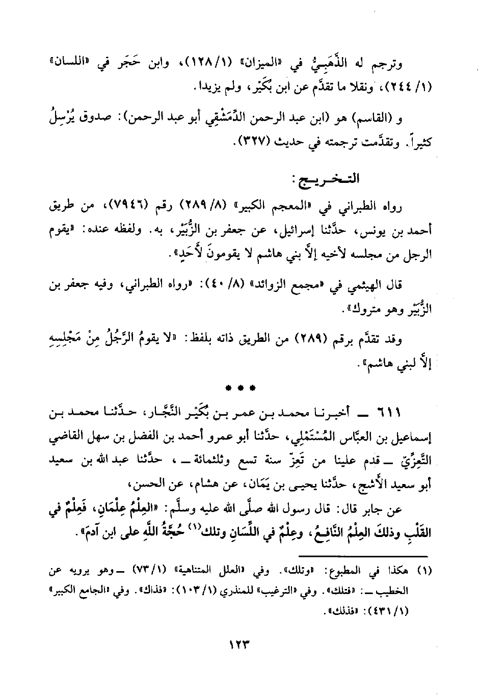 عن جابر قال: قال رسول اللَّه صلَّى اللَّه عليه وسلَّم: "العِلْمُ عِلْمَانِ، فَعِلْمٌ في القَلْبِ وذلك العِلْمُ النَّافِعُ، وعِلْمٌ في اللِّسَانِ وتلك (¬١) حُجَّةُ اللَّهِ على ابن آدمَ".