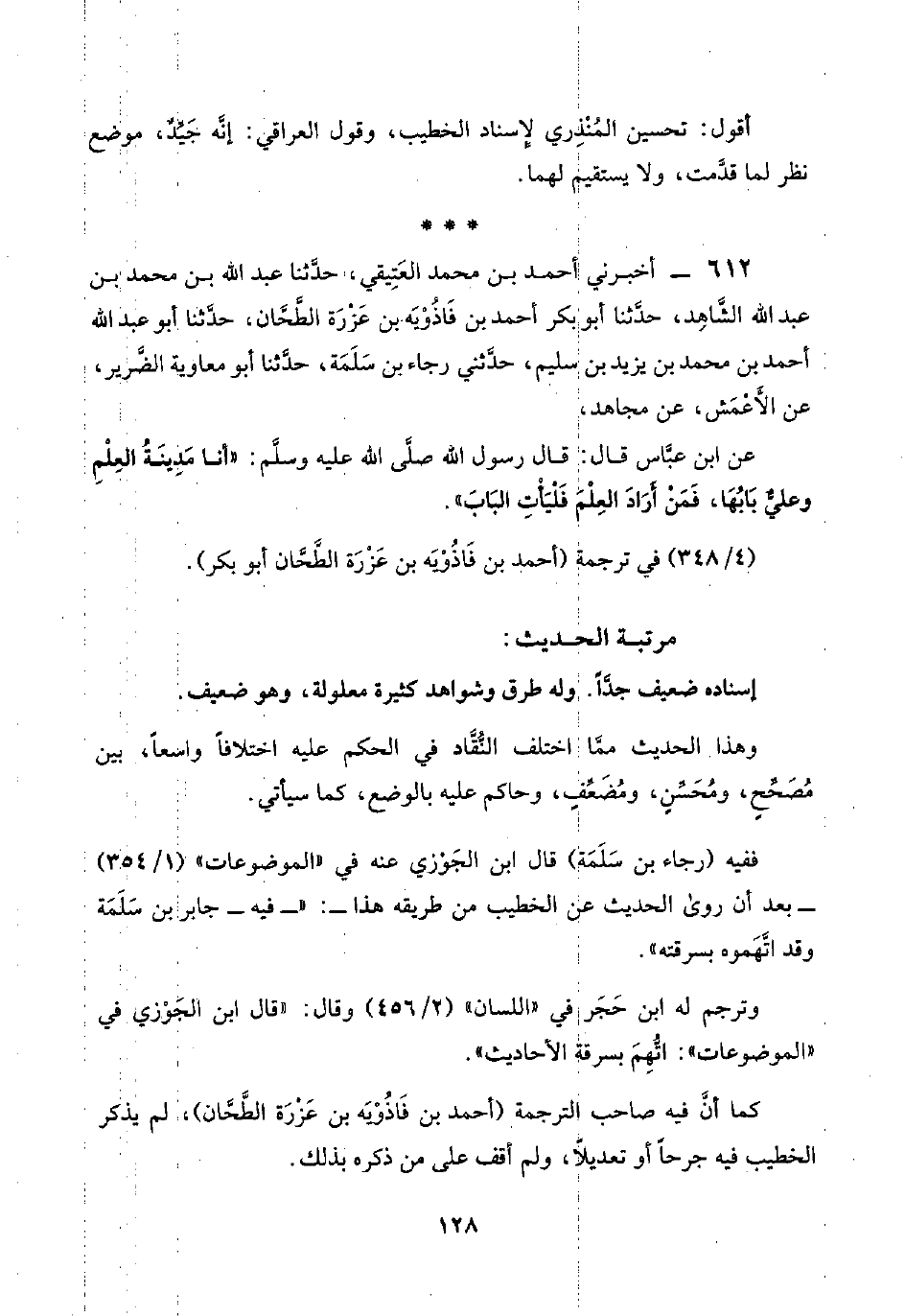 عن ابن عبَّاس قال: قال رسول اللَّه صلَّى اللَّه عليه وسلَّم: "أنا مَدِينَةُ العِلْمِ وعليٌّ بَابُهَا، فَمَنْ أَرَادَ العِلْمَ فَلْيَأْتِ البَابَ".