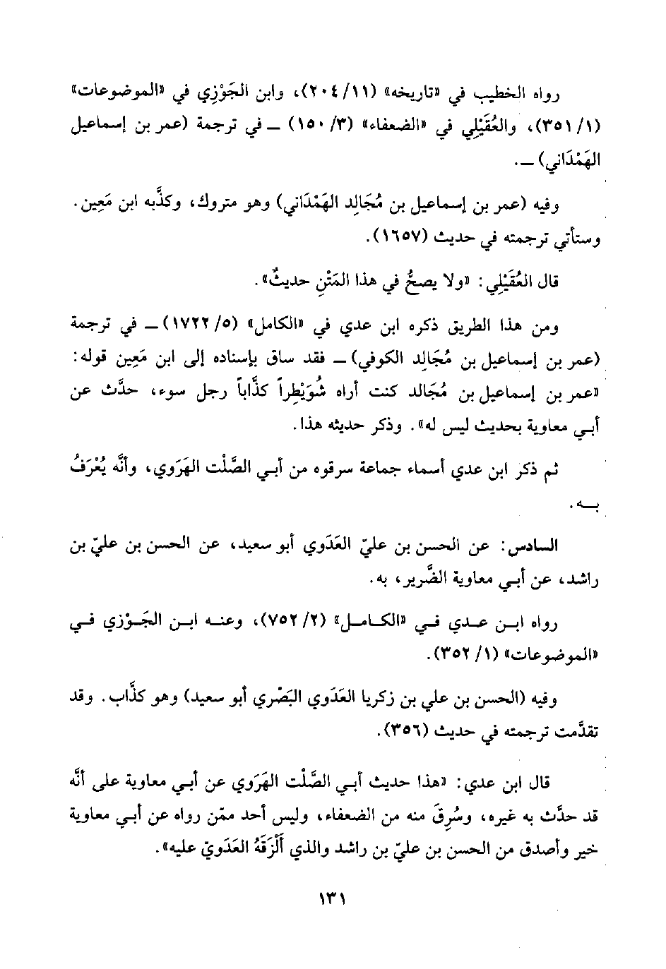 قال ابن عدي: هذا حديث أبي الصَّلْت الهَرَوي عن أبي معاوية على أنَّه قد حدَّث به غيره، وسُرِقَ منه من الضعفاء، وليس أحد ممّن رواه عن أبي معاوية خير وأصدق من الحسن بن عليّ بن راشد والذي أَلْزَقَهُ العَدَويّ عليه".