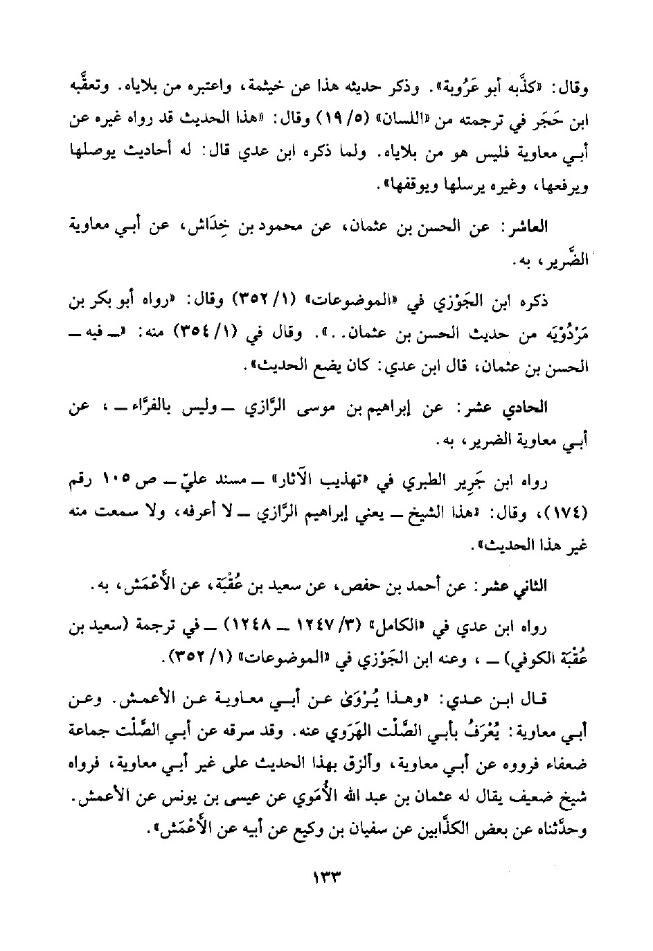 وقال: "كذَّبه أبو عَرُوبة". وذكر حديثه هذا عن خيثمة، واعتبره من بلاياه. وتعقَّبه ابن حَجَر في ترجمته من "اللسان" (٥/ ١٩) وقال: "هذا الحديث قد رواه غيره عن أبي معاوية فليس هو من بلاياه. ولما ذكره ابن عدي قال: له أحاديث يوصلها ويرفعها، وغيره يرسلها ويوقفها".