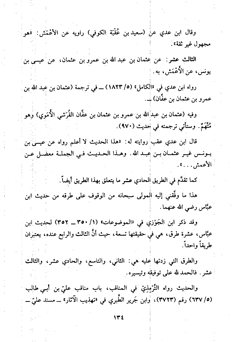 قال ابن عدي عقب روايته له: "هذا الحديث لا أعلم رواه عن عيسى بن يونس غير عثمان بن عبد اللَّه. وهذا الحديث في الجملة معضل عن الأعمش. . . ".
