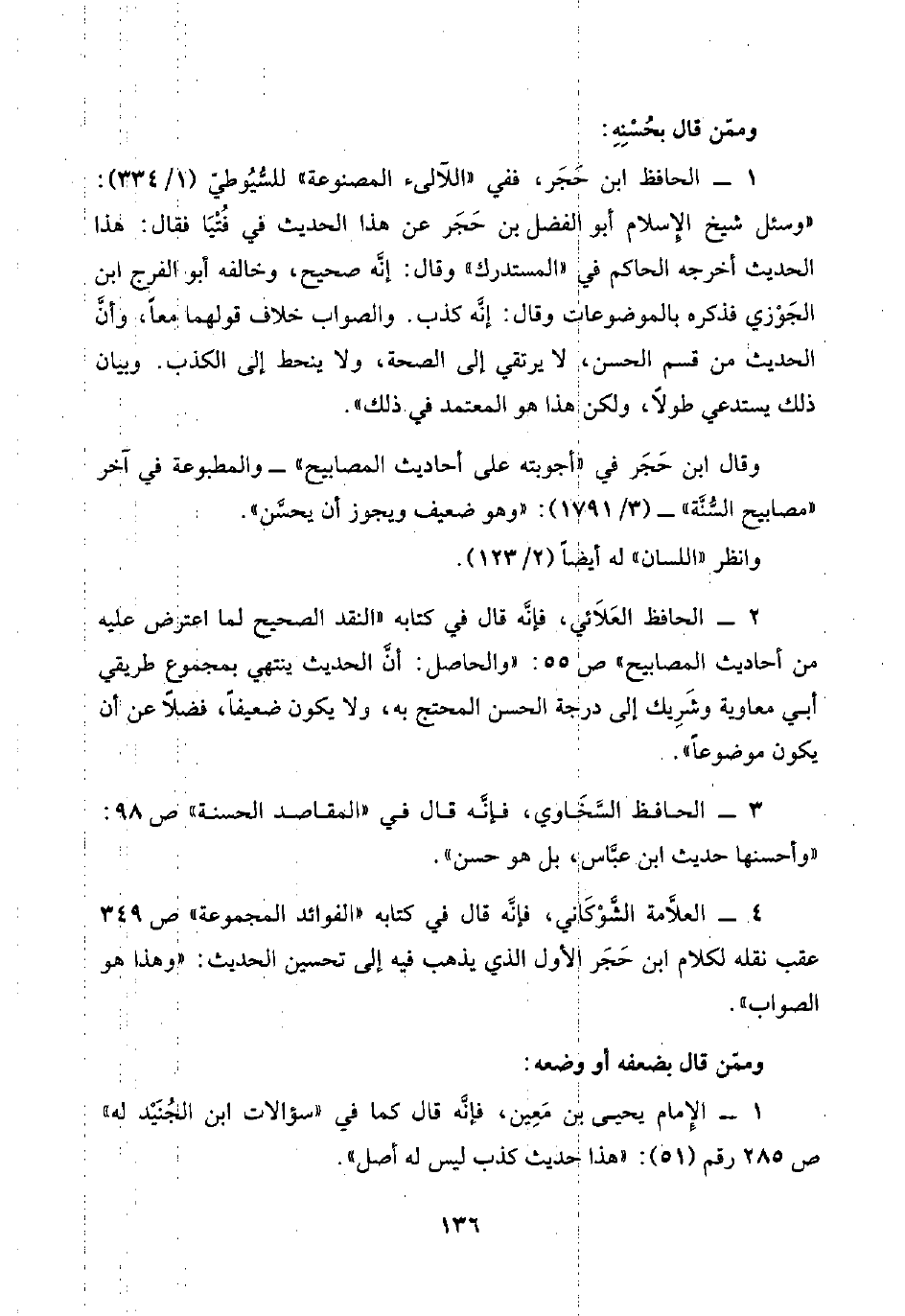 ١ - الحافظ ابن حَجَر، ففي "اللآلئ المصنوعة" للسُّيُوطيّ (١/ ٣٣٤): "وسئل شيخ الإسلام أبو الفضل بن حَجَر عن هذا الحديث في فُتْيَا فقال: هذا الحديث أخرجه الحاكم في "المستدرك" وقال: إنَّه صحيح، وخالفه أبو الفرج ابن الجَوْزي فذكره بالموضوعات وقال: إنَّه كذب. والصواب خلاف قولهما معًا، وأنَّ الحديث من قسم الحسن، لا يرتقي إلى الصحة، ولا ينحط إلى الكذب. وبيان ذلك يستدعي طولًا، ولكن هذا هو المعتمد في ذلك".