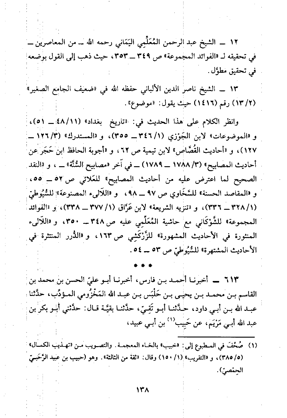 ١٢ - الشيخ عبد الرحمن المُعَلِّمِي اليَمَاني رحمه اللَّه -من المعاصرين- في تحقيقه لـ "الفوائد المجموعة" ص ٣٤٩ - ٣٥٣، حيث ذهب إلى القول بوضعه في تحقيق مطوَّل.