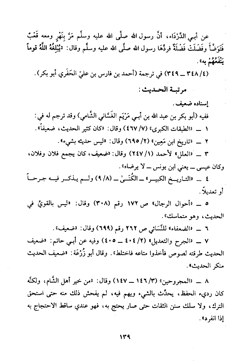 ٨ - "المجروحين" (٣/ ١٤٦ - ١٤٧) وقال: "من خير أهل الشَّام، ولكنَّه كان رديء الحفظ، يحدِّث بالشيء ويهم فيه، لم يفحش ذلك منه حتى استحق الترك، ولا سلك سنن الثقات حتى صار يحتج به، فهو عندي ساقط الاحتجاج به إذا انفرد".
