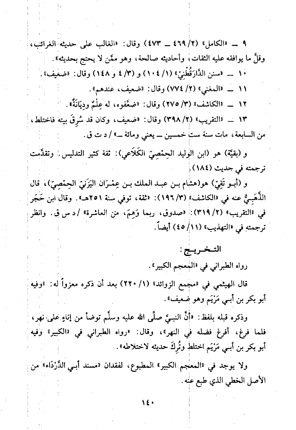 وذكره قبله بلفظ: "أنَّ النبيَّ صلَّى اللَّه عليه وسلَّم توضأ من إناءٍ على نهر، فلما فرغ، أفرغ فضله في النهر"، وقال: "رواه الطبراني في "الكبير" وفيه أبو بكر بن أبي مَرْيَم اختلط وتُرِكَ حديثه لاختلاطه".