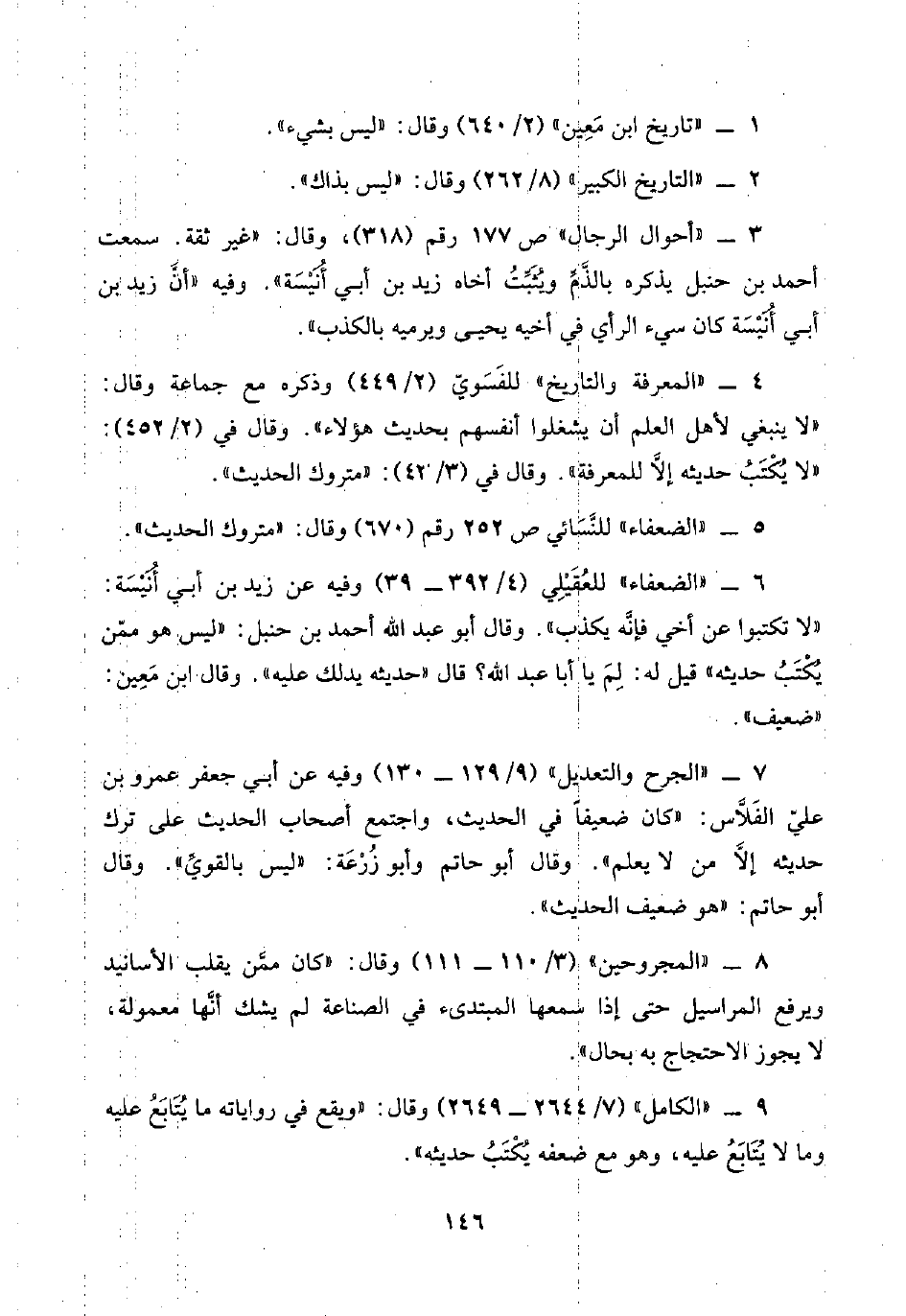 ٧ - "الجرح والتعديل" (٩/ ١٢٩ - ١٣٠) وفيه عن أبي جعفر عمرو بن عليّ الفَلَّاس: "كان ضعيفًا في الحديث، واجتمع أصحاب الحديث على ترك حديثه إلَّا من لا يعلم". وقال أبو حاتم وأبو زُرْعَة: "ليس بالقويِّ". وقال أبو حاتم: "هو ضعيف الحديث".