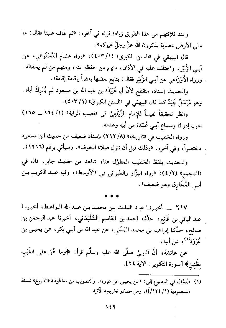 ٦١٧ - أخبرنا عبد الملك بن محمد بن عبد اللَّه الواعظ، أخبرنا عبد الباقي بن قَانِع، حدَّثنا أحمد بن القاسم السُّلَيْمَاني، أخبرنا عبد الرحمن بن صالح، حدَّثنا إبراهيم بن محمد المَدَني، عن عبد اللَّه بن أبي بكر، عن يحيى بن عُرْوَة (¬١)، عن أبيه،