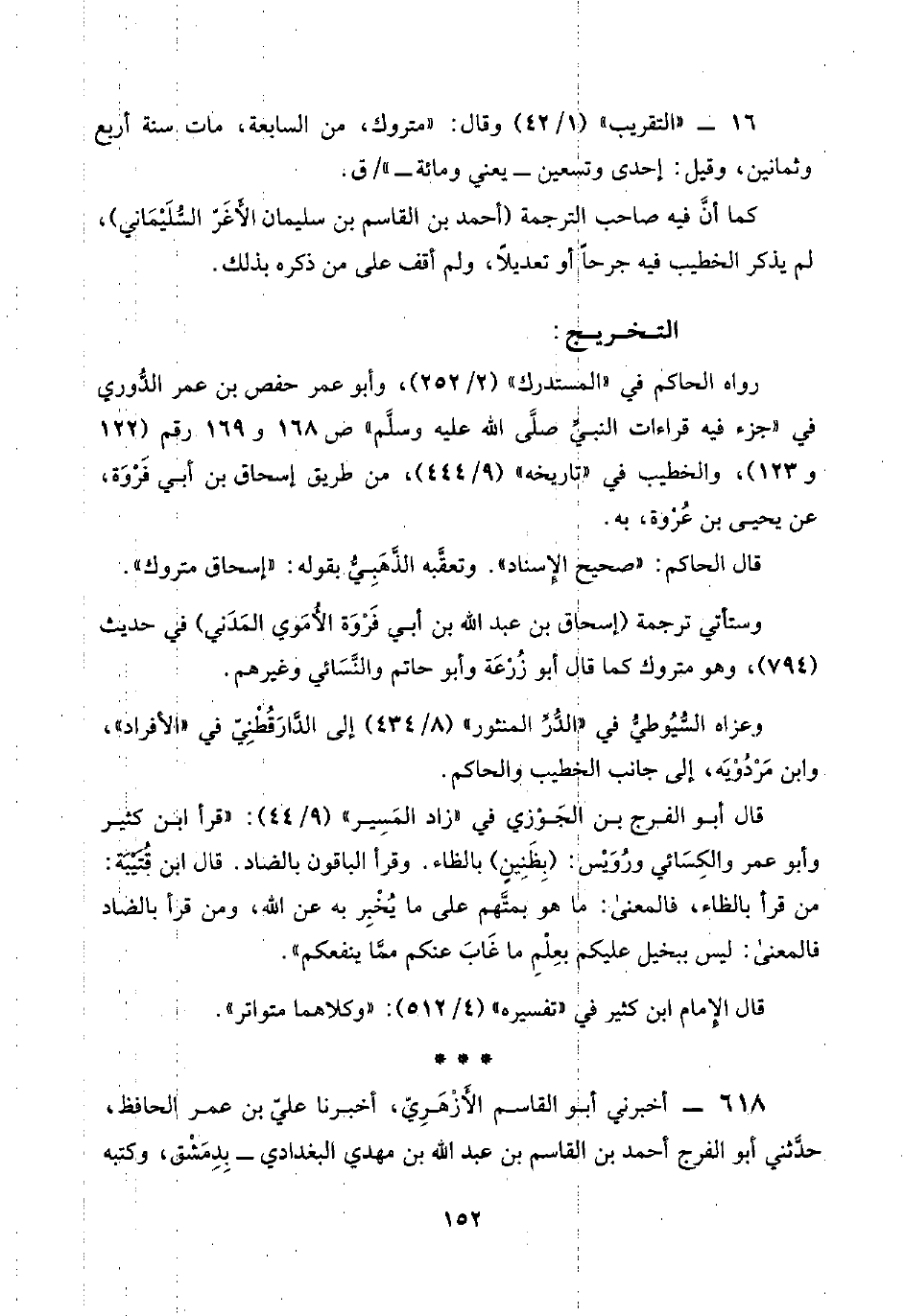 ٦١٨ - أخبرني أبو القاسم الأَزْهَرِيّ، أخبرنا عليّ بن عمر الحافظ، حدَّثني أبو الفرج أحمد بن القاسم بن عبد اللَّه بن مهدي البغدادي -بِدِمَشْق، وكتبه
