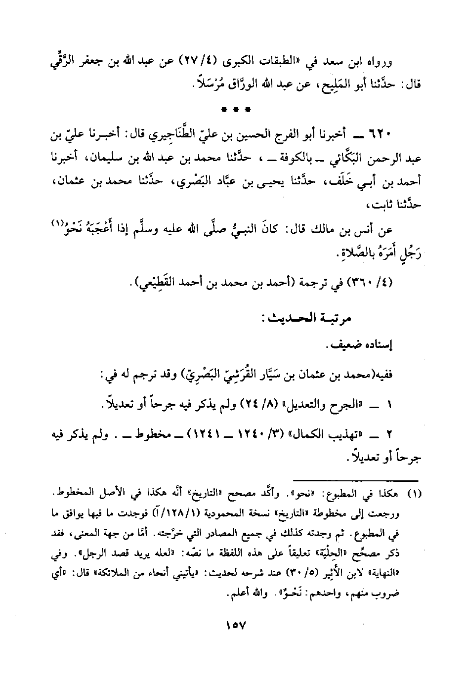 (¬١) هكذا في المطبوع: "نحوه". وأكَّد مصحح "التاريخ" أنَّه هكذا في الأصل المخطوط. ورجعت إلى مخطوطة "التاريخ" نسخة المحمودية (١/ ١٢٨/ آ) فوجدت ما فيها يوافق ما في المطبوع. ثم وجدته كذلك في جميع المصادر التي خرَّجته. أمَّا من جهة المعنى، فقد ذكر مصحِّح "الحِلْيَة" تعليقًا على هذه اللفظة ما نصّه: "لعله يريد قصد الرجل". وفي "النهاية" لابن الأَثِير (٥/ ٣٠) عند شرحه لحديث: "يأتيني أنحاء من الملائكة" قال: "أي ضروب منهم، وأحدهم: نَحْوٌ". واللَّه أعلم.