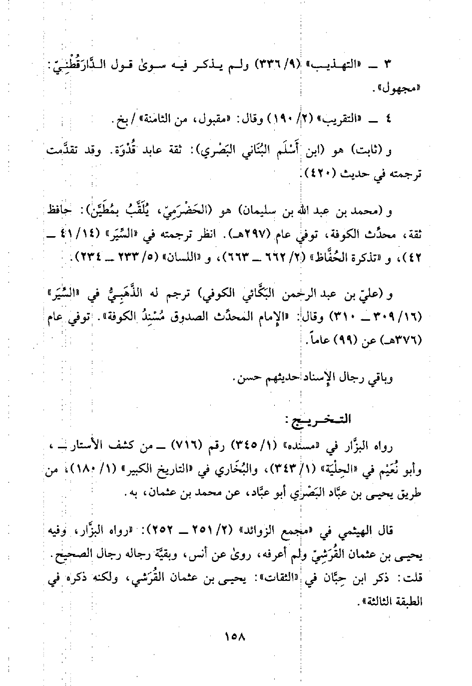 قال الهيثمي في "مجمع الزوائد" (٢/ ٢٥١ - ٢٥٢): "رواه البزَّار، وفيه يحيى بن عثمان القُرَشِيّ ولم أعرفه، روى عن أنس، وبقيَّة رجاله رجال الصحيح. قلت: ذكر ابن حِبَّان في "الثقات": يحيى بن عثمان القُرَشي، ولكنه ذكره في الطبقة الثالثة".