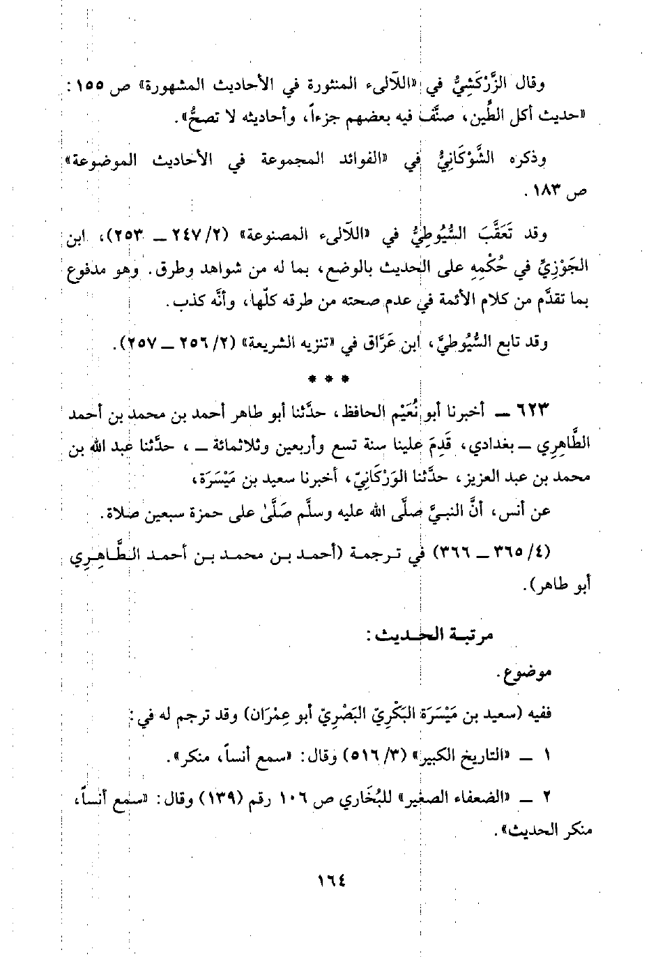 ٦٢٣ - أخبرنا أبو نُعَيْم الحافظ، حدَّثنا أبو طاهر أحمد بن محمد بن أحمد الطَّاهِرِي -بغدادي، قَدِم علينا سنة تسع وأربعين وثلاثمائة-، حدَّثنا عبد اللَّه بن محمد بن عبد العزيز، حدَّثنا الوَرْكَانِيّ، أخبرنا سعيد بن مَيْسَرَة،