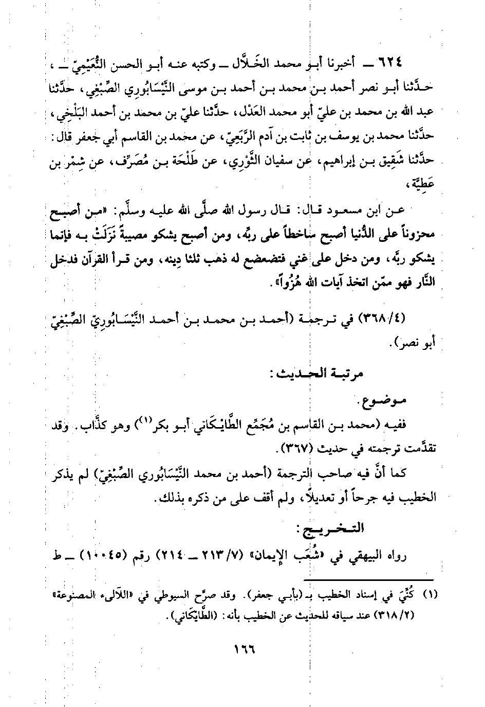 ٦٢٤ - أخبرنا أبو محمد الخَلَّال -وكتبه عنه أبو الحسن النُّعَيْمِيّ-، حدَّثنا أبو نصر أحمد بن محمد بن أحمد بن موسى النَّيْسَابُورِي الصِّبْغِي، حدَّثنا عبد اللَّه بن محمد بن عليّ أبو محمد العَدْل، حدَّثنا عليّ بن محمد بن أحمد البَلْخِي، حدَّثنا محمد بن يوسف بن ثابت بن آدم الرَّبَعِيّ، عن محمد بن القاسم أبي جعفر قال: حدَّثنا شَقِيق بن إبراهيم، عن سفيان الثَّوْرِي، عن طَلْحَة بن مُصَرِّف، عن شِمْر بن عَطِيَّة،