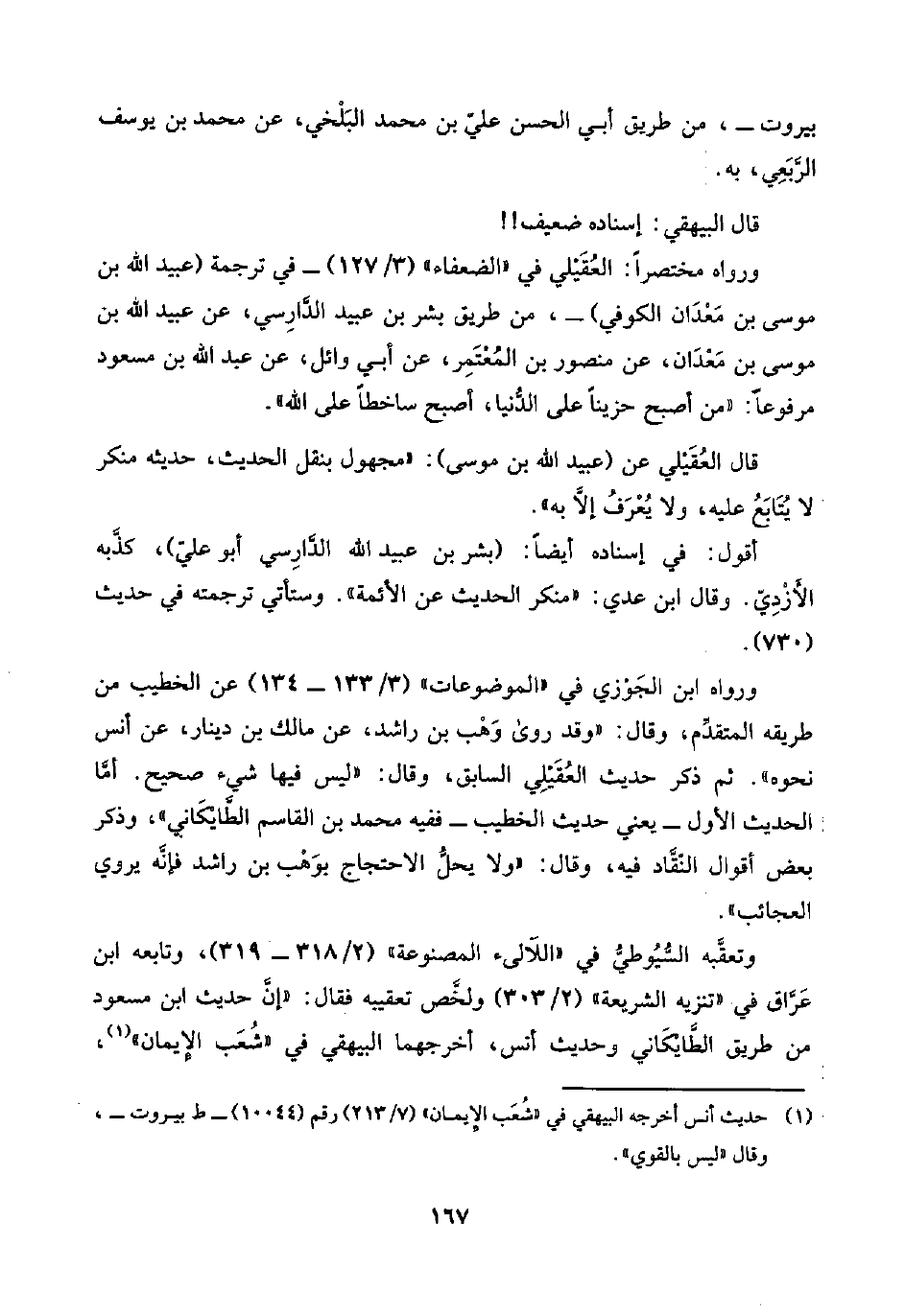 وتعقَّبه السُّيُوطيُّ في "اللآلئ المصنوعة" (٢/ ٣١٨ - ٣١٩)، وتابعه ابن عَرَّاق في "تنزيه الشريعة" (٢/ ٣٠٣) ولخَّص تعقيبه فقال: "إنَّ حديث ابن مسعود من طريق الطَّايْكَاني وحديث أنس، أخرجهما البيهقي في "شُعَب الإِيمان" (¬١)،