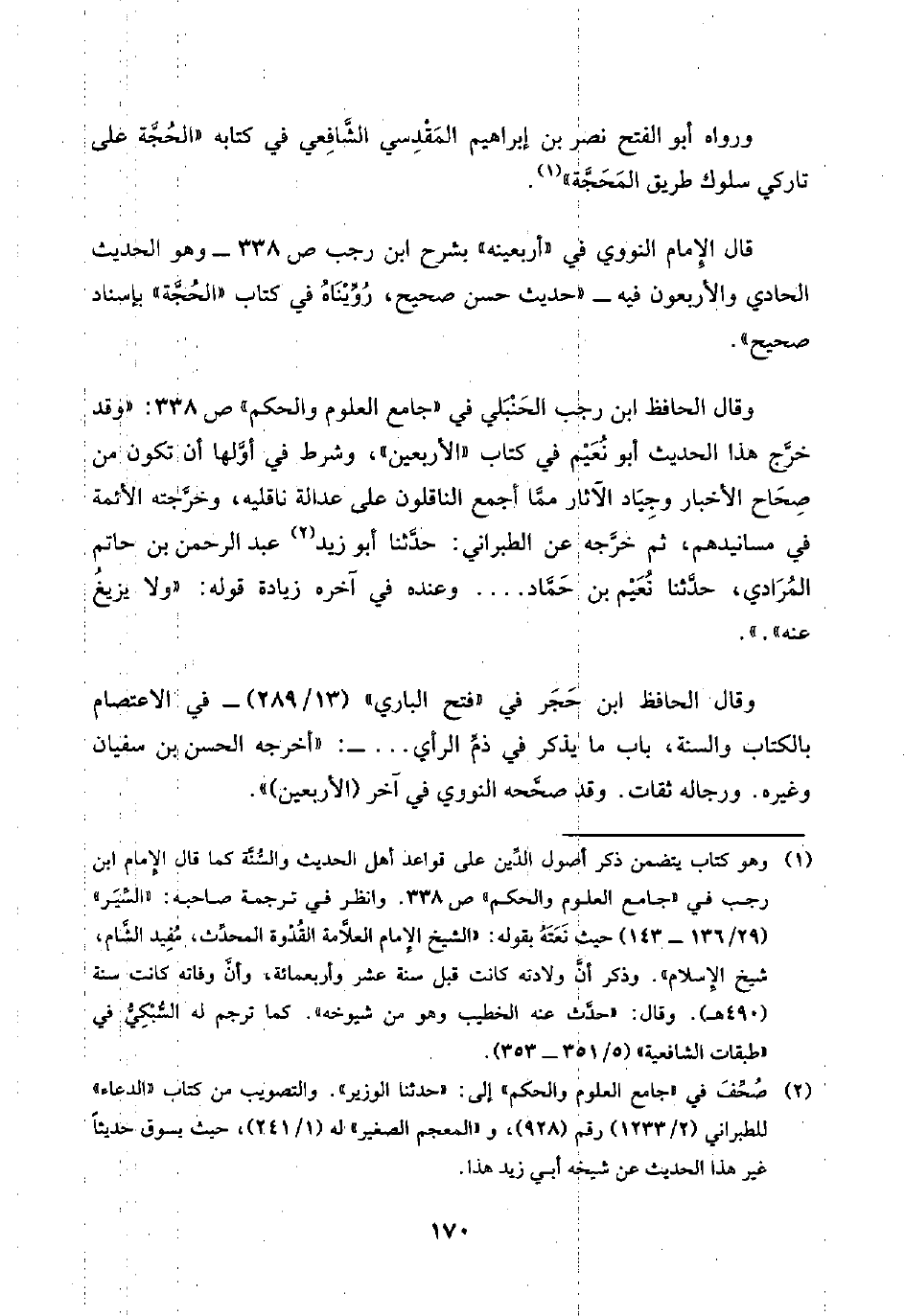 وقال الحافظ ابن حَجَر في "فتح الباري" (١٣/ ٢٨٩) -في الاعتصام بالكتاب والسنة، باب ما يذكر في ذمَّ الرأي. . . -: "أخرجه الحسن بن سفيان وغيره. ورجاله ثقات. وقد صحَّحة النووي في آخر (الأربعين) ".