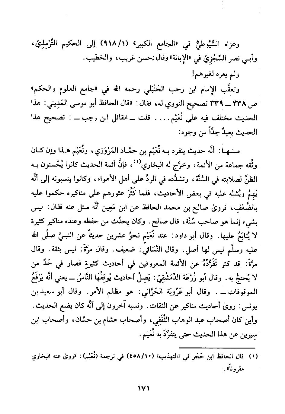 وتعقَّب الإِمام ابن رجب الحَنْبَلي رحمه اللَّه في "جامع العلوم والحكم" ص ٣٣٨ - ٣٣٩ تصحيح النووي له، فقال: "قال الحافظ أبو موسى المَدِيني: هذا الحديث مختلف فيه على نُعَيْم. . . . قلت -القائل ابن رجب-: تصحيح هذا الحديث بعيدٌ جدًّا من وجوه:
