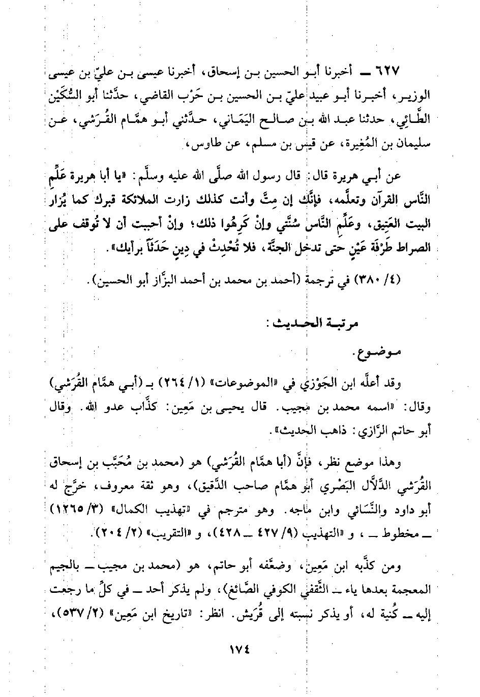 ٦٢٧ - أخبرنا أبو الحسين بن إسحاق، أخبرنا عيسى بن عليّ بن عيسى الوزير، أخبرنا أبو عبيد عليّ بن الحسين بن حَرْب القاضي، حدَّثنا أبو السُّكَيْن الطَّائِي، حدثنا عبد اللَّه بن صالح اليَمَاني، حدَّثني أبو همَّام القُرَشي، عن سليمان بن المُغِيرة، عن قيس بن مسلم، عن طاوس،