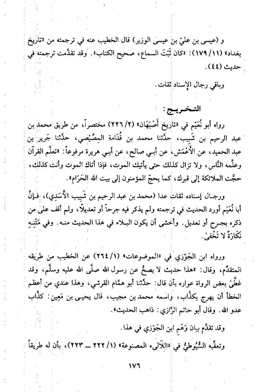 رواه أبو نُعَيْم في "تاريخ أَصْبَهَان" (٢/ ٢٢٦) مختصرًا، من طريق محمد بن عبد الرحيم بن شَبِيب، حدَّثنا محمد بن قُدَامة المِصِّيْصي، حدَّثنا جَرير بن عبد الحميد، عن الأَعْمَش، عن أبي صالح، عن أبي هريرة مرفوعًا: "تعلَّم القرآن وعلَّمه النَّاس، ولا تزال كذلك حتى يأتيك الموت، فإذا أتاك الموت وأنت كذلك، حجَّت الملائكة إلى قبرك، كما يحجّ المؤمنون إلى بيت اللَّه الحَرَام".