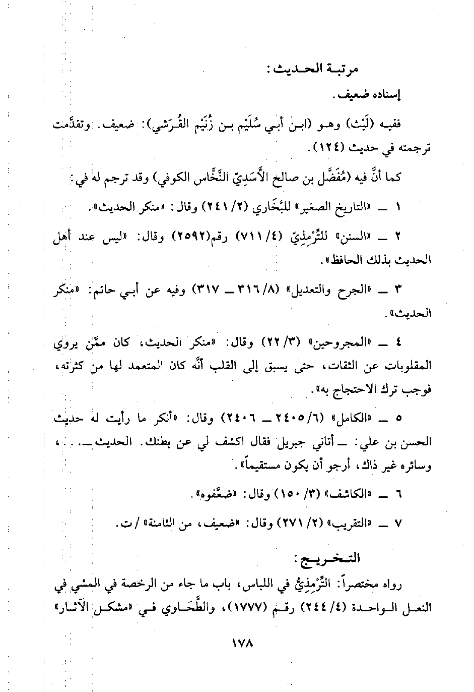 رواه مختصرًا: التِّرْمِذِيُّ في اللباس، باب ما جاء من الرخصة في المشي في النعل الواحدة (٤/ ٢٤٤) رقم (١٧٧٧)، والطَّحَاوي في "مشكل الآثار"