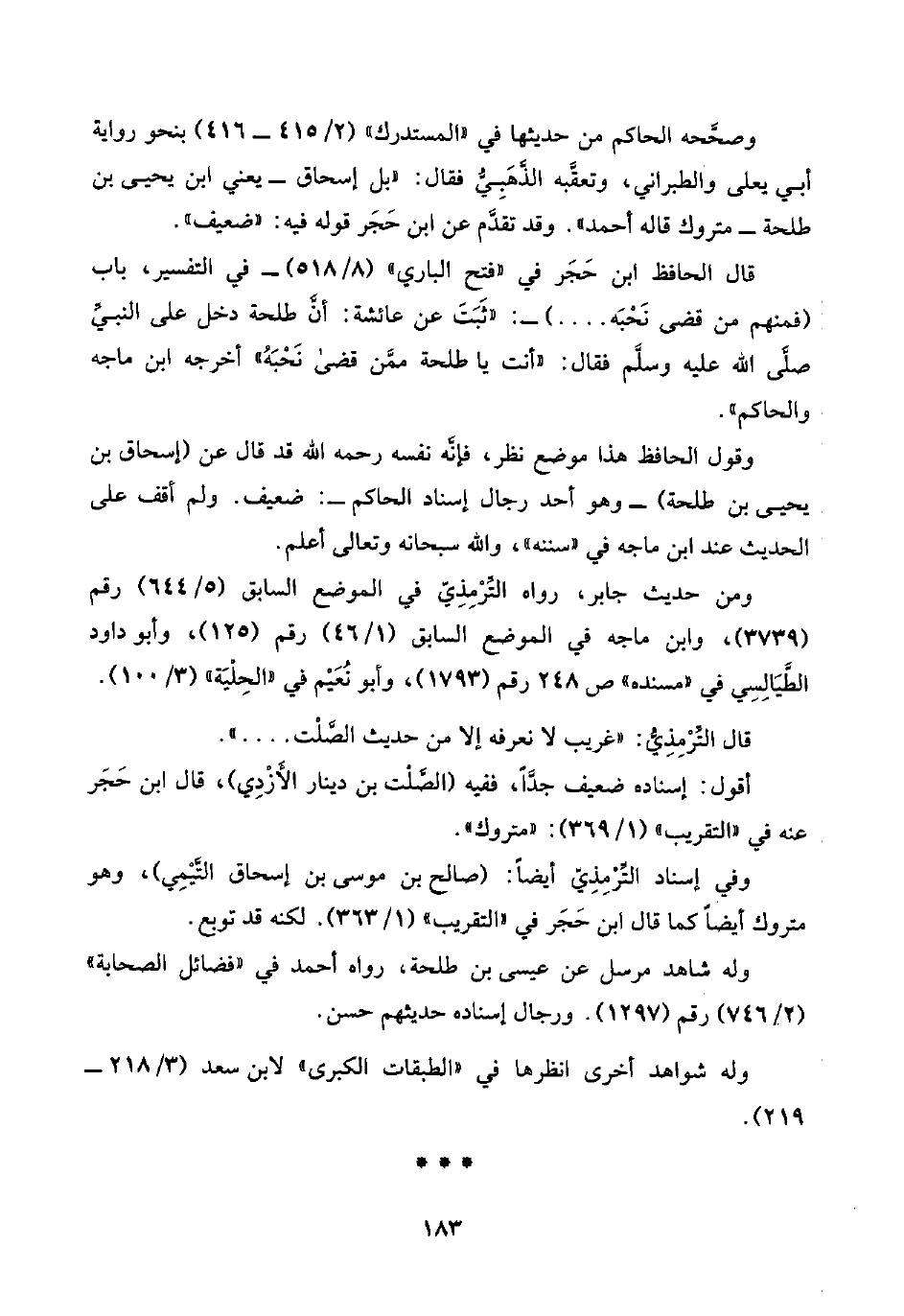قال الحافظ ابن حَجَر في "فتح الباري" (٨/ ٥١٨) -في التفسير، باب (فمنهم من قضى نَحْبَه. . . .) -: "ثَبَتَ عن عائشة: أنَّ طلحة دخل على النبيَّ صلَّى اللَّه عليه وسلَّم فقال: "أنت يا طلحة ممَّن قضى نَخْبَهُ" أخرجه ابن ماجه والحاكم".