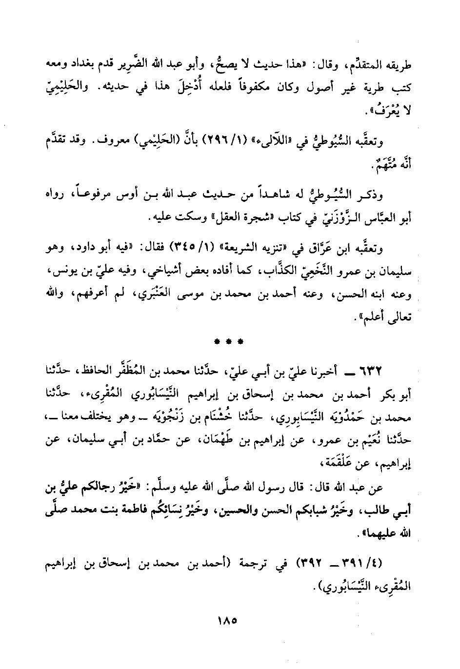 عن عبد اللَّه قال: قال رسول اللَّه صلَّى اللَّه عليه وسلَّم: "خَيْرُ رجالكم عليُّ بن أبي طالب، وخَيْرُ شبابكم الحسن والحسين، وخَيْرُ نِسَائكُم فاطمة بنت محمد صلَّى اللَّه عليهما".